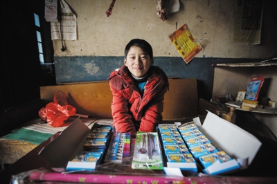 2月5日,河南确山县双河镇韩楼村,留守儿童一帆从集上回来,把买来的全部年货都摆在了桌上:3盒鞭炮、一袋烟花、一盒彩笔和一副筷子、勺子。