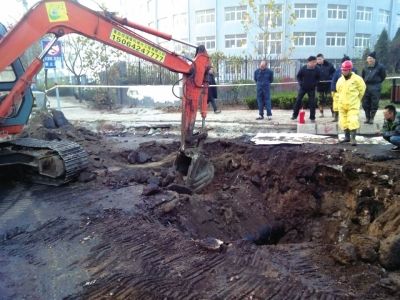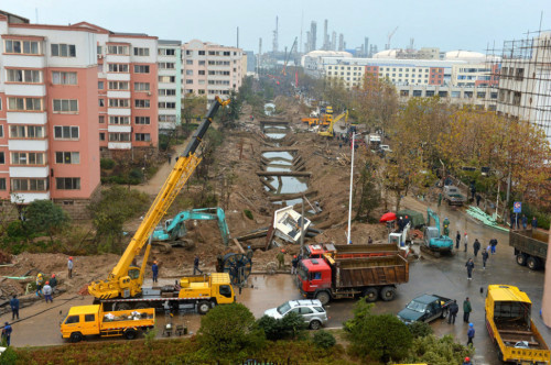 2013年11月24日,各路人马在故斋堂岛街中石化黄潍输油管线爆燃事现场进行清理工作。