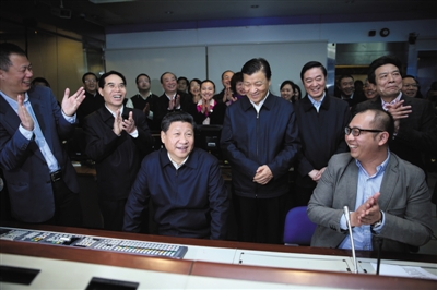 临近中午,习近平来到中央电视台。他听取中央电视台板块业务、媒体融合等情况介绍,到总控中心观看电视传播能力建设视频展示,在《新闻联播》演播室、导 控室向主持人和工作人员了解新闻制作导播流程,并亲自切换按钮体验模拟播出。习近平指出,中央电视台每天面对数亿观众,一定要紧跟时代、放眼全球,多设计 一些融思想性、艺术性于一体的好栏目,多创办一些脍炙人口、寓教于乐的好节目。