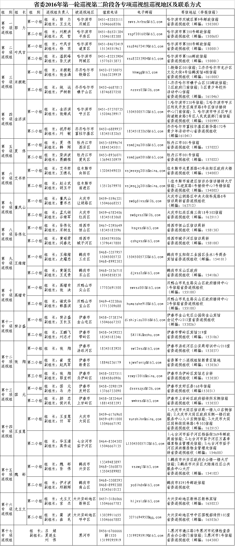 按照黑龙江省委统一部署,4月18日至22日,省委2016年第一轮巡视第二阶段16个专项巡视组已陆续进驻哈尔滨市双城区等33个区,开展约1个月的专项巡视;4月28日,1个专项巡视组进驻黑河市,开展约20天的巡视“回头看”。