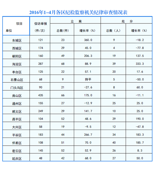 人民网北京5月13日电 据中央纪委监察部网站消息,2016年1月至4月,北京市各级纪检监察机关共接受信访举报5407件(次),立案815件,增长59.5%。给予党纪政纪处分532人,增长52%,其中局级1人,县处级138人,乡科级122人。移送司法25人。查处违反中央八项规定精神和市委实施意见123人,“小官贪腐”104人。