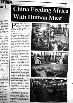 文中说道,赞比亚政府强烈谴责不道德的媒体刊发关于中国向南部非洲销售人肉的文章。赞比亚外交部公共关系官员多卡斯说,今年5月17日,一家私营报纸“KACHEPA”(意为八卦、传言)刊登了这篇不实文章,宣称中国将人肉罐头出口到南部非洲。
