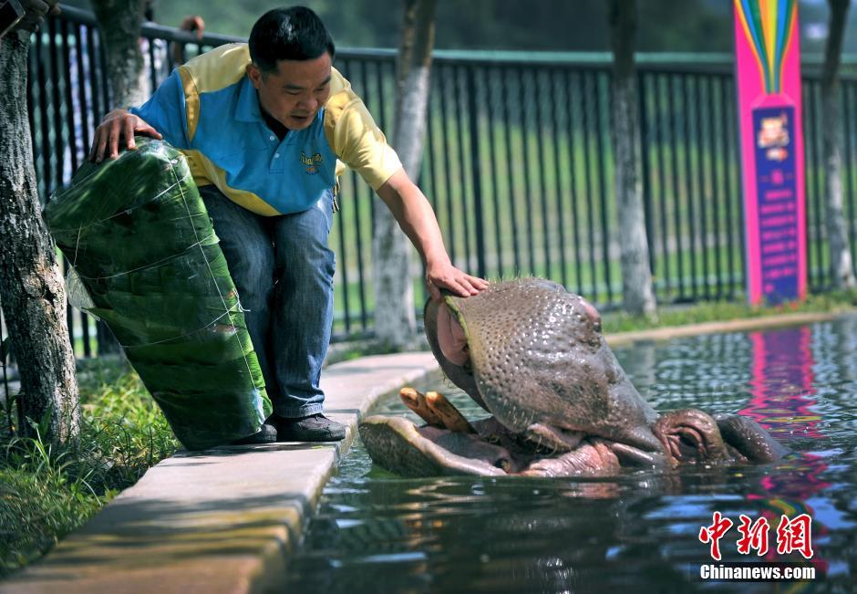 每到端午,家家户户忙着买粽叶、包粽子,一时间粽叶幽青、糯米飘香。端午节,重庆永川一野生动物园的动物们也尝到了粽子的美味。图为为了给河马吃上粽子,饲养员费尽了心思。这只巨粽,用了一斤多粽叶。钟欣 摄