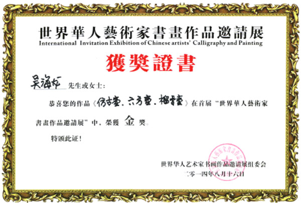 2014年8月16日,吴海龙大师仿古壶、六方壶、榴香壶作品在首届世界华人艺术家书画作品邀请展中荣获金奖。