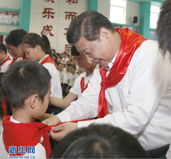 2016年5月30日上午,中共中央总书记、国家主席、中央军委主席习近平来到北京市海淀区民族小学,参加庆祝“六一”国际儿童节活动。这是习近平在少先队入队仪式上,为新少先队员系上红领巾。新华社记者鞠鹏摄