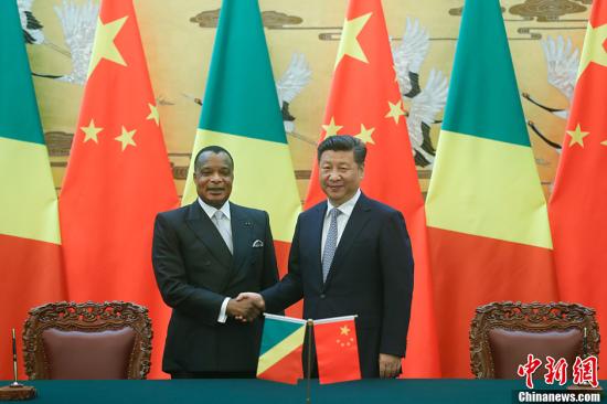 7月5日,中国国家主席习近平在北京人民大会堂与刚果共和国总统萨苏举行会谈。会谈后,两国元首共同见证了外交、产能、经济技术、农业、文化、基础设施、金融及地方交流等领域双边合作文件的签署。中新社记者 盛佳鹏 摄