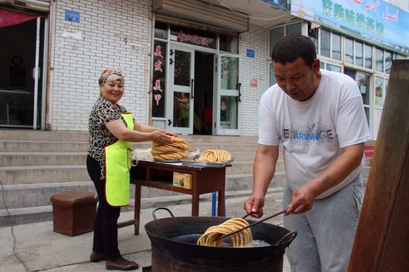 裕民县哈拉布拉镇哈萨克族居民叶尔肯别克和妻子在油炸馓子。