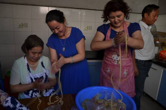 哈密市,维吾尔族和汉族居民们围坐在一起做馓子。
