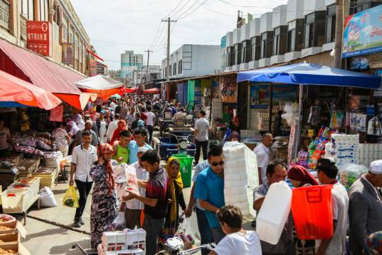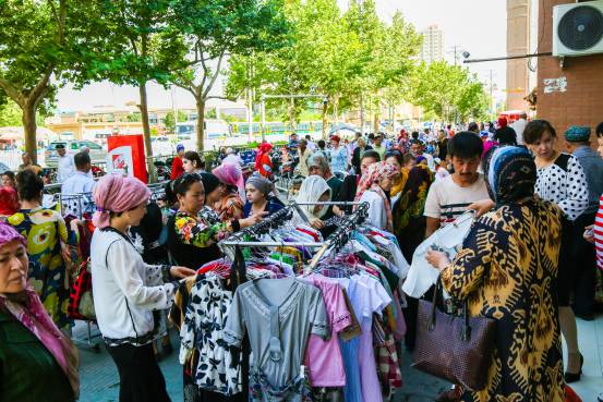 在穆斯林群众传统节日肉孜节到来之际,喀什群众逛街购物喜迎节日的到来。7月6日是肉孜节。按照习俗,当日,穆斯林群众穿新衣,制作丰盛的美食,庆祝这一节日。