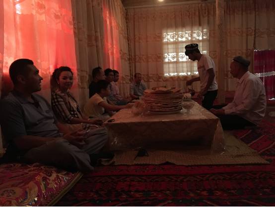 7月6日,肉孜节当天,和田市玉龙喀什镇阿亚克依格孜艾日克村。村民买买提托合提·马合木提邀请工作组、村干部到家吃饭,共庆肉孜节。