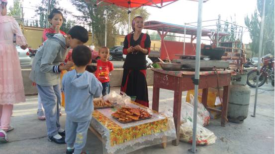 7月6日早上的阿图什市铁提村村委会门口,小商贩们摆起了摊子,开始一天的生意,吸引孩子们前来品尝。