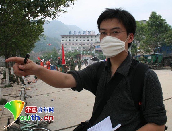 2008年5月13日,孙铁翔在北川县城进行抗震救灾采访报道。本人供图