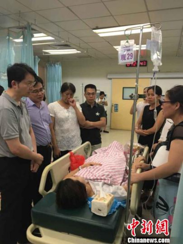 6月23日晚10时许,广西医科大学第一附属医院急诊科,发生一起伤医事件。一名女护士被一名患者的陪人打伤。 图为被打女护士被送医治疗。 蓝飞燕 摄