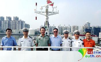 日前,著名军事专家、中国战略文化促进会常务副会长兼秘书长罗援少将(左3)登上中国海监船,为海监队员助威。