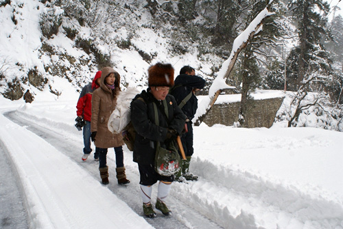 大雪封山,江德华徒步和同事们去办案。 资料图