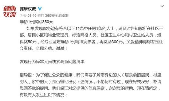 消息称,如果发现身边有符合以下11条中任何1条的人士,请及时告知所在社区干部、居民小区和物业管理员、综治网格人员、社区卫生中心和村卫生站人员,爆料奖50元。如果经专业鉴定确诊1例精神病患者,再奖励300元。