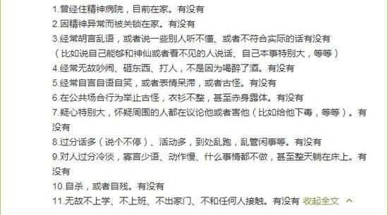 所谓的11条,即判断对方是否曾经有下述11种情况出现:曾经住精神病院,目前在家;因精神异常而被关锁在家;经常胡言乱语,或者说一些别人听不 懂、或者不符合实际的话(比如说自己能够和神仙或者看不见的人说话、自己本事特别大,等等);经常无故吵闹、砸东西、打人,不是因为喝醉了酒;经常自言自 语自笑,或者表情呆滞,或者古怪;在公共场合行为举止古怪,衣衫不整,甚至赤身露体有没有;疑心特别大,怀疑周围的人都在议论他或者害他(比如给他下毒, 等等);过分话多(说个不停)、活动多,到处乱跑,乱管闲事等;对人过分冷淡,寡言少语、动作慢、什么事情都不做,甚至整天躺在床上;自杀,或者自残;无 故不上学、不上班、不出家门、不和任何人接触。