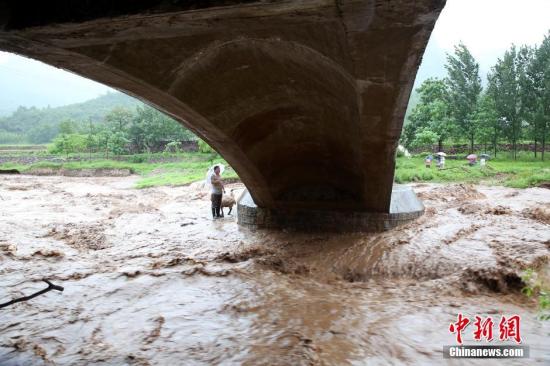 7月19日下午,河南省济源市,受强降雨影响,当地九里沟河水猛涨,一名正在九里沟引沁渠桥下放羊的村民和20多只山羊,被猛涨的洪水困在河道,无法回到岸上。现场,滚滚河水冲击着桥墩,发出轰隆隆的响声,水位还在不断上涨,情形十分危急。当地消防迅速出动,在洪水里救人又救羊。 古少杰 摄