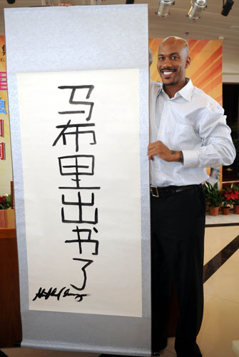 图为2012年5月10日,北京首钢篮球俱乐部外援马布里展示自己用毛笔书写的“马布里出书了”条幅。新华社发