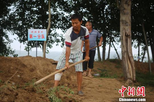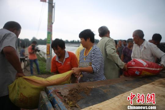 饶阳县村民自发组织装填沙土、背运沙袋护卫堤防。