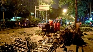 昨天凌晨零点左右,北京晨报记者到达日坛路南口。只见一排高大的杨树都已经倒地,其中大部分都是连根拔起,杨树的树干已经砸在了主路上。记者看到,几名身穿橘色工作服的园林部门工作人员先将树干锯断,再分次装上车子拉走。此外,一辆停放在树下的灰色轿车被倒地的大树砸到了车顶。车子的顶部已经凹了进去,左侧两个车门已经无法关闭,挡风玻璃也已经破碎。