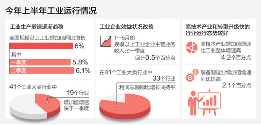 “所谓缓中趋稳主要表现在三个方面。”冯飞说,一是规模以上工业增加值增速较稳,上半年6%的增长,与年初提出的预期增长目标基本吻合;制造业对工业稳增长的支撑作用增强,上半年制造业增加值增速6.9%,比一季度加快0.4个百分点。