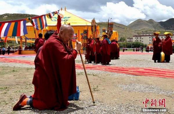 此事发生在西藏日喀则,说具体点就是班禅时轮金刚灌顶法会现场。7月23日,记者亲眼看到,有位老人特别显眼,他身着的僧袍与周围藏族僧袍略有不同,不像是藏区的。中午12点一过,他就跪在班禅大师必经之地的黄色莲花宝毯旁。别人告诉他,班禅为信众灌顶要到下午两点才开始,气温这么高,赶紧起来,到阴凉处等候,别跪坏了身子。