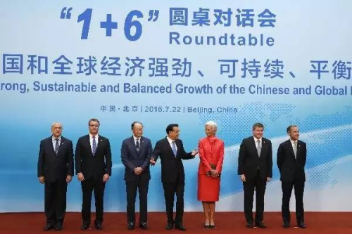 国务院总理李克强22日上午同世界银行行长金墉、国际货币基金组织总裁拉加德、世界贸易组织总干事阿泽维多、国际劳工组织总干事莱德、经济合作与发展组织秘书长古里亚、金融稳定理事会主席卡尼举行1+6圆桌对话会,这是类似对话会史上首次在中国举行。