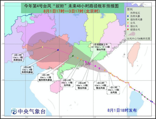 今年第4号台风“妮妲”于7月30日17时在菲律宾以东洋面上生成,此后向西北方向一路奔袭,31日8时加强为强热带风暴,23时加强为台风,8月1日凌晨转入中国南海北部海域。