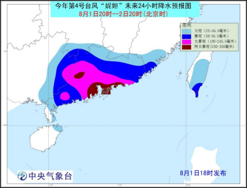 从风力来看,根据预报,8月1日20时至2日20时,南海北部的大部海面、广东中东部沿海及珠三角地区将有9-12级大风,“妮妲”中心经过的附近海面和地区风力13-15级,阵风可达16级。从降水来看,广东珠三角及东部沿海地区局地有特大暴雨(250~350毫米)。