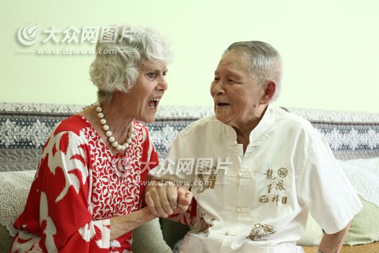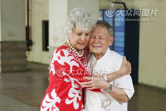 回忆起当年潍县集中营的经历,玛丽和王成汉激动地握起了手。(亓翔 摄)