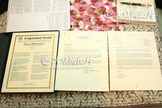这次与王成汉见面,玛丽还带来了一份特殊的礼物。它们是来自美国驻中国大使馆的大使马克斯·西本·鲍克斯(Max Sieben Baucus)和州参议院主席斯蒂芬·斯威尼(Stephen Sweeney)的公告与礼物;一些当年被从潍县集中营解救出来的难民写给王先生的感谢信;美国代表唐纳德·诺克罗斯(U.S. Rep Donald Norcross)也因王先生的“无私的行为与贡献”将其姓名写进了国会记录。玛丽将这些信件亲手交到王成汉手中,两位老人戴上老花镜,认认真真地翻看起来。王成汉用颤抖的手指抚摸着这些信件,忍不住轻轻读出了声。