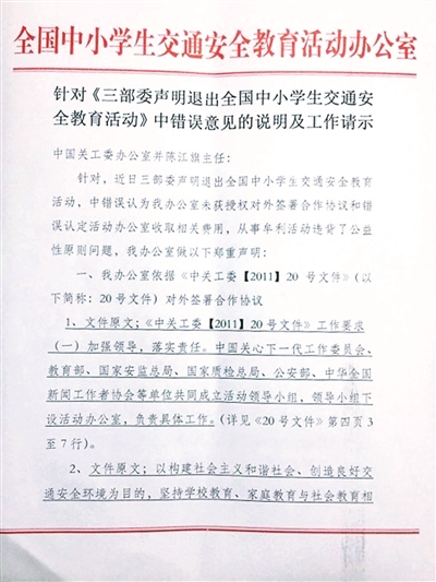 这份名为“针对《三部委声明退出全国中小学生交通安全教育活动》中错误意见的说明及工作请示”中,首先回应了“未获三部委授权”的质疑,称安全教育办公室是依据中国关工委[2011]20号文件对外签署的协议,“按照指导思想联合社会各界共同开展学生教育工作,为明确合作双方的责、权、利,必然要签署合作协议。”
