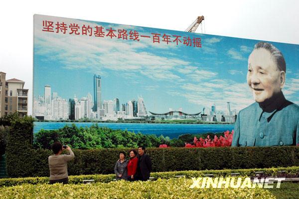 资料图片:2008年12月13日,人们在深圳福田中心区的邓小平画像前留影。新华社记者 彭勇摄