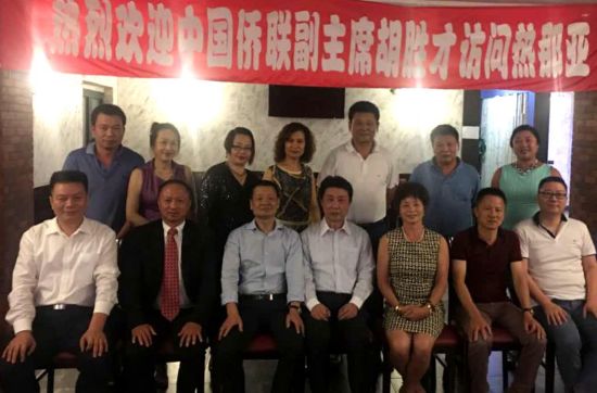 代表团团长、中国侨联副主席胡胜才和出席座谈的部分侨领合影。