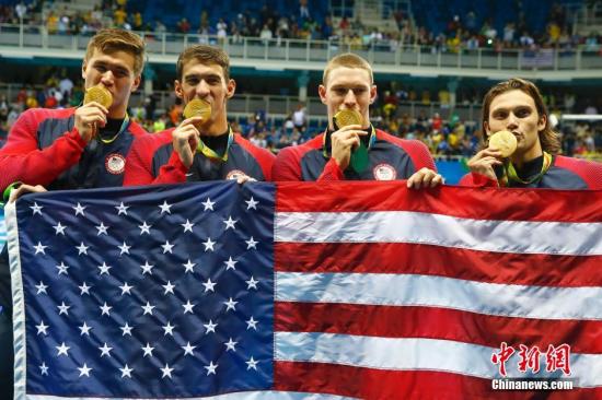 8月13日,在里约奥运会游泳赛场最后一天的比赛中,菲尔普斯领衔的美国队在男子4X100米混合泳接力决赛中,获得冠军,这块金牌成为菲尔普斯的奥运会第23金,完美收官。中国队因为犯规被取消成绩。图为美国队集体吻金牌庆祝。中新网记者 富田 摄