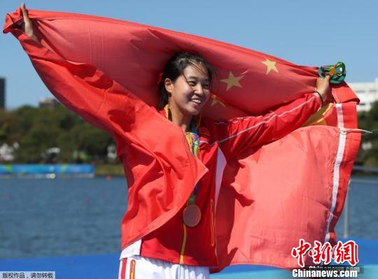 当地时间8月13日,里约奥运女子单人双桨决赛,中国选手段静莉以7分24秒13的成绩摘得铜牌。图为段静莉身披国旗展示铜牌。