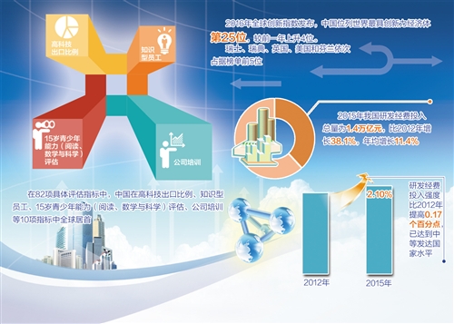 在评估高校水平、科学出版物和国际专利申请量的顶层指标“创新质量”中,中国名列第17位,成为中等收入经济体的领头羊。在82项具体评估指标中,中国在高科技出口比例、知识型员工、15岁青少年能力(阅读、数学与科学)评估、公司培训等10项指标中全球居首;在全球性公司研发投入、知识与技术产出、无形资产等方面优势显著。