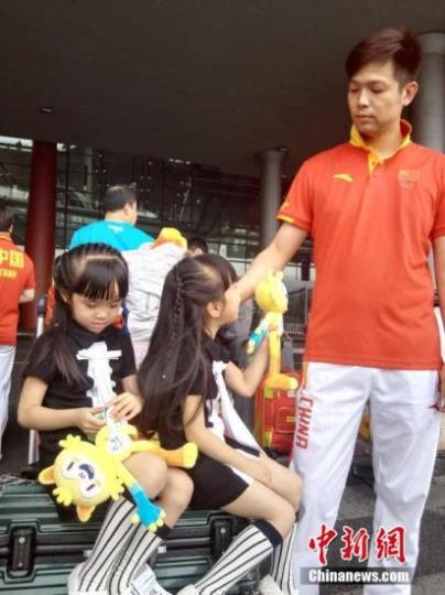 北京时间8月17日上午9时许,朱启南随中国射击队回国,他的妻子和一对双胞胎女儿现身北京首都机场迎接他们归来。见面后朱启南与妻子说的第一句话就是“你辛苦了”,妻子回道“不会”。图文 尚虹波 张珺
