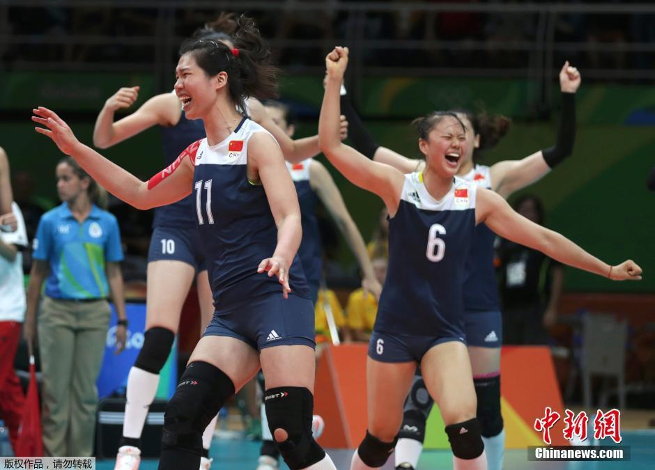 当地时间8月18日,2016里约奥运会女排半决赛,中国队3:1战胜荷兰队晋级决赛。这是中国女排时隔12年再次进入奥运决赛。图为中国姑娘庆祝胜利。