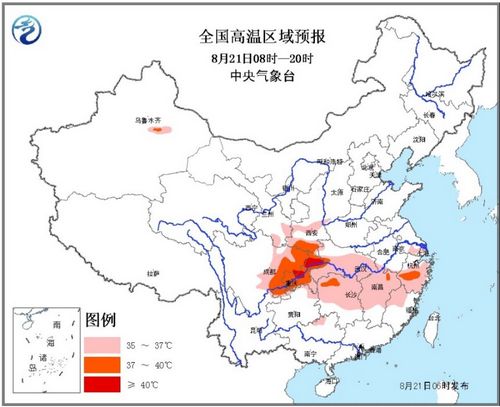中新网8月21日电 据中央气象台网站消息,8月20日06时继续发布高温黄色预警:预计,20日白天,陕西关中及南部地区、甘肃南部、四川盆地、重庆、江汉大部、江淮南部、江南大部、贵州东北部、广西北部和南疆盆地东北部等地有35℃以上的高温天气。