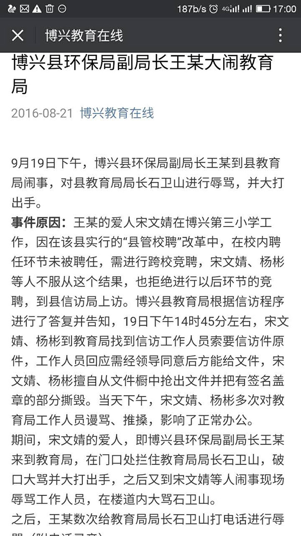 8月21日,山东省滨州市博兴县教育局在其官方微信“博兴教育在线”,发布题为《博兴县环保局副局长王某大闹教育局》的文章,称8月19日下午,博兴县环保局副局长王某到县教育局闹事,对博兴县教育局局长石卫山进行辱骂,并大打出手。