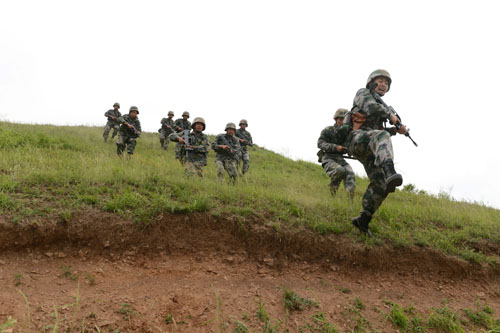 资料图:陆军第39集团军某红军旅官兵在演习中发起冲锋(2016年5月14日摄)。