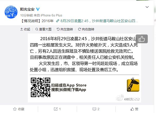 8月29日凌晨2:45,深圳宝安区沙井街道马鞍山社区安山四路一出租屋发生火灾,3时许火势被扑灭。