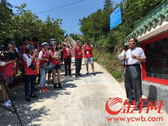 采访团到达油山镇革命纪念碑,老区建设促进会常务副会长林树雄介绍老一辈无产阶级革命家在油山的革命斗争历程。