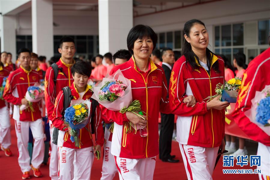 8月29日,中国女排主教练郎平(右二)等抵达澳门外港码头。当日,里约奥运会内地奥运精英代表团一行抵达澳门外港码头,展开为期4天的访问。澳门特区政府在码头举行了欢迎仪式。新华社记者张金加摄