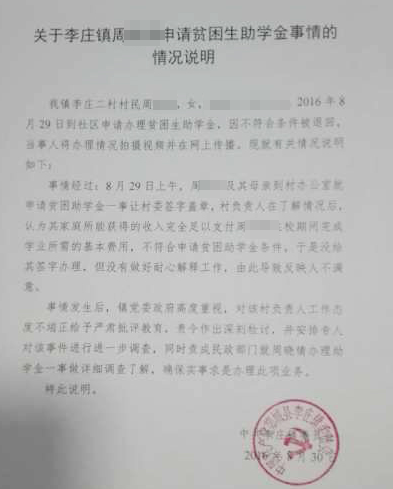 事情发生后,李庄镇党委政府高度重视,对视频中的村负责人工作态度不端正给予严肃批评教育,责令作出深刻检讨,并安排专人对该事件进行进一步调查。同时,责成民政部门就村民周某某办理助学金一事做详细调查了解,确保实事求是办理此项业务。(大众网-山东24小时客户端记者 王磊 见习记者 冯媛媛)