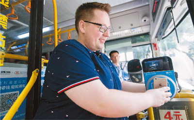 德国“网红”阿福在杭州的公交车上用支付宝“刷卡”。