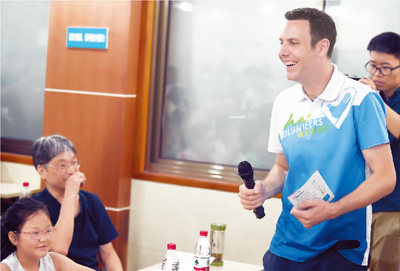 来自浙江大学的志愿者、澳大利亚留学生提姆在杭州东山弄社区教居民学英语。