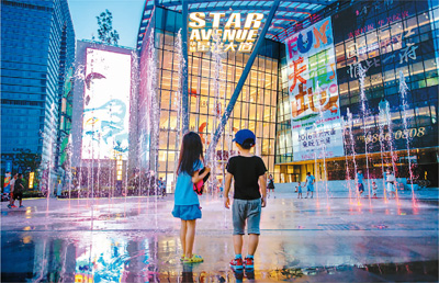 8月26日,小朋友在杭州市滨江区一家商场门口观赏音乐喷泉。